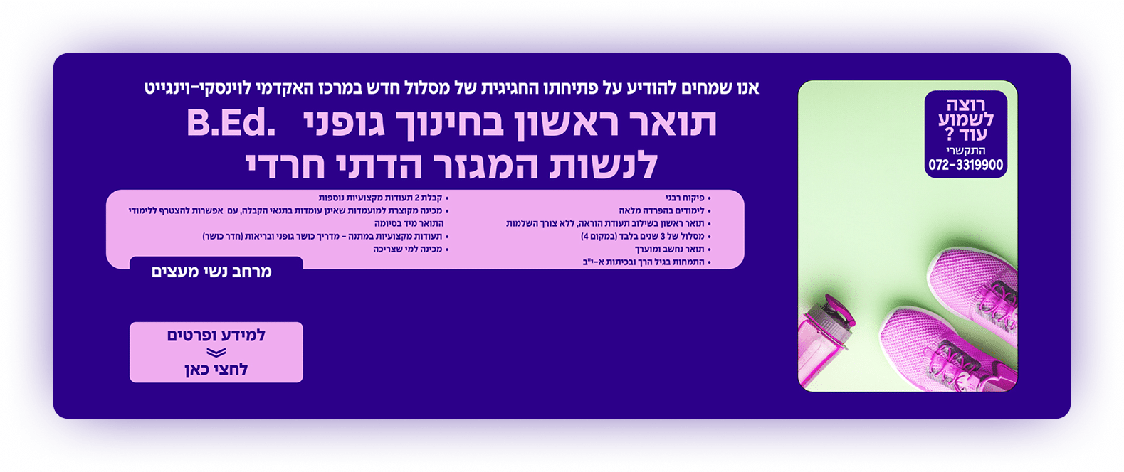 כיום לאחר עשור של מאמצים להביא בשורה לבנות המגזר החרדי בתחום הכושר, הצליחה ד"ר בנין בשיתוף המרכז האקדמי לוינסקי-וינגייט, להשיק לראשונה בישראל:
