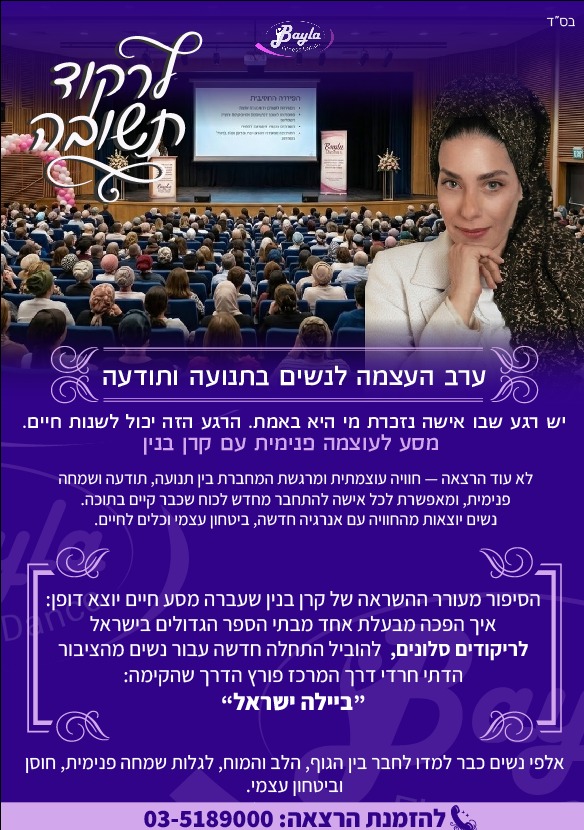 סיפור התשובה של ד"ר קרן בנין – מבית ספר למחול בתחום הריקודים הסלוניים ולטינים ועבודה בעולם הדוגמנות, ערכית דין, לעולם של תשובה, יהדות והקמת ביילה ישראל – המרכז הגבוה למחול בשיטת ביילה פיטנס דאנס העברת נשים מסע התפתחות אישית, תודעתית ומקצועית. בהרצאה קרן משלבת את סיפור התשובה עם מסרים עוצמתיים לשיפור החיים באופן מיידי תוך העברת המשתתפות חוויית מחול מותאמת שכן כל שינוי ביהדות מסבירים – מחשבה, דיבור, מעשה. איך לשנות את השיח הפנימי שלנו המשליך באופן ישיר על כל חיינו. איך מייצרים תוצאות דרך מחשבה, דיבור ומעשה?
